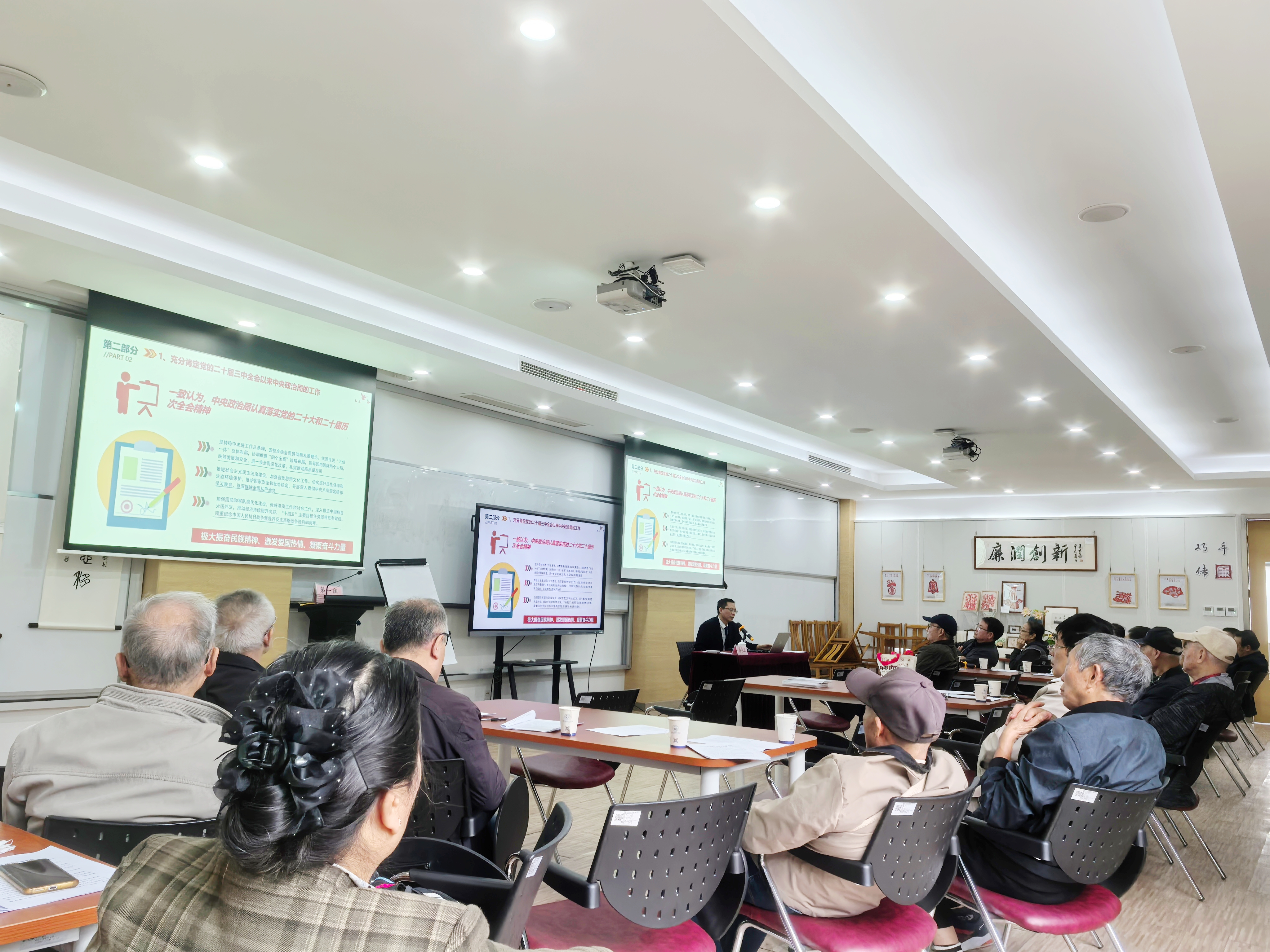 教学研究部副主任顾承卫应邀为老同志们作《党的二十届四中全会精神学习》的专题辅导报告。顾承卫紧紧围绕二十届四中全会概况、全会《建议》的核心要义以及《建议》对科技事业的重大部署三个方面,结合详实的数据与生动的实例,对全会精神进行了系统梳理和深入解读。老同志们全程凝神聆听,认真记录,对国家发展的宏伟蓝图和战略布局有了更全面的理解。下会后,支部组织全体党员观看影片《志愿军:浴血和平》,影片的动人情节让大家深感和平幸福生活来之不易。
