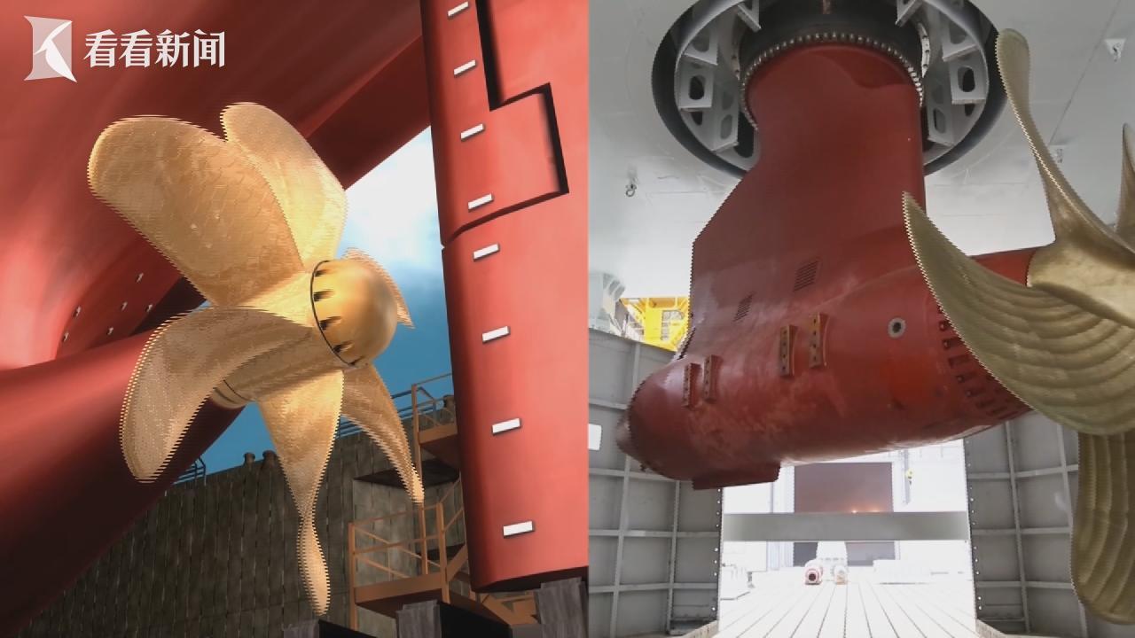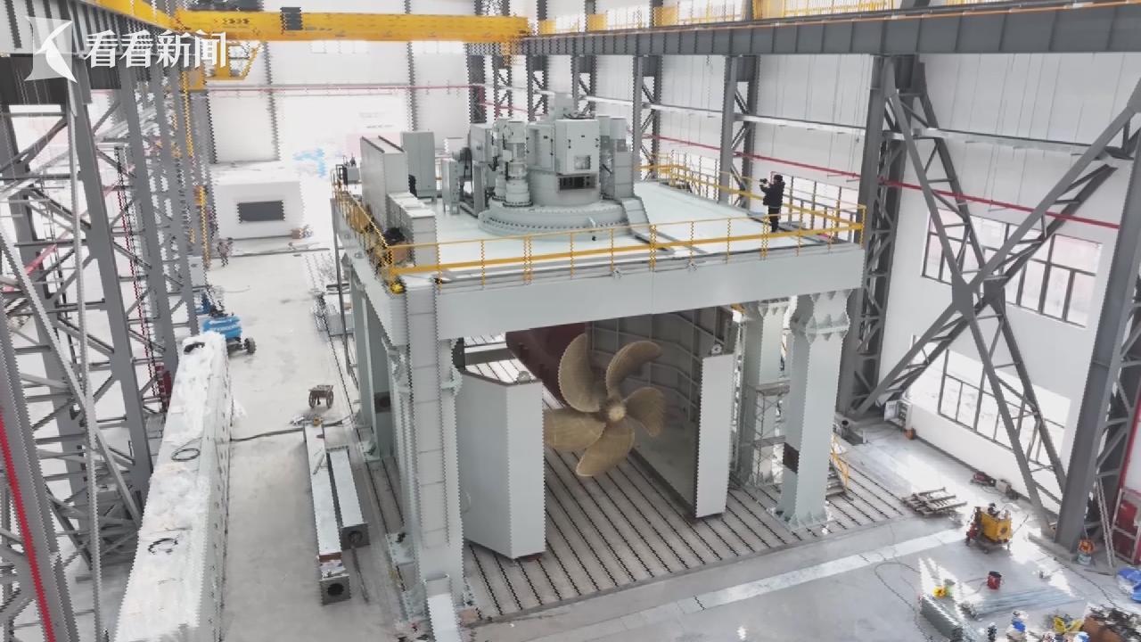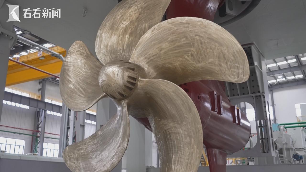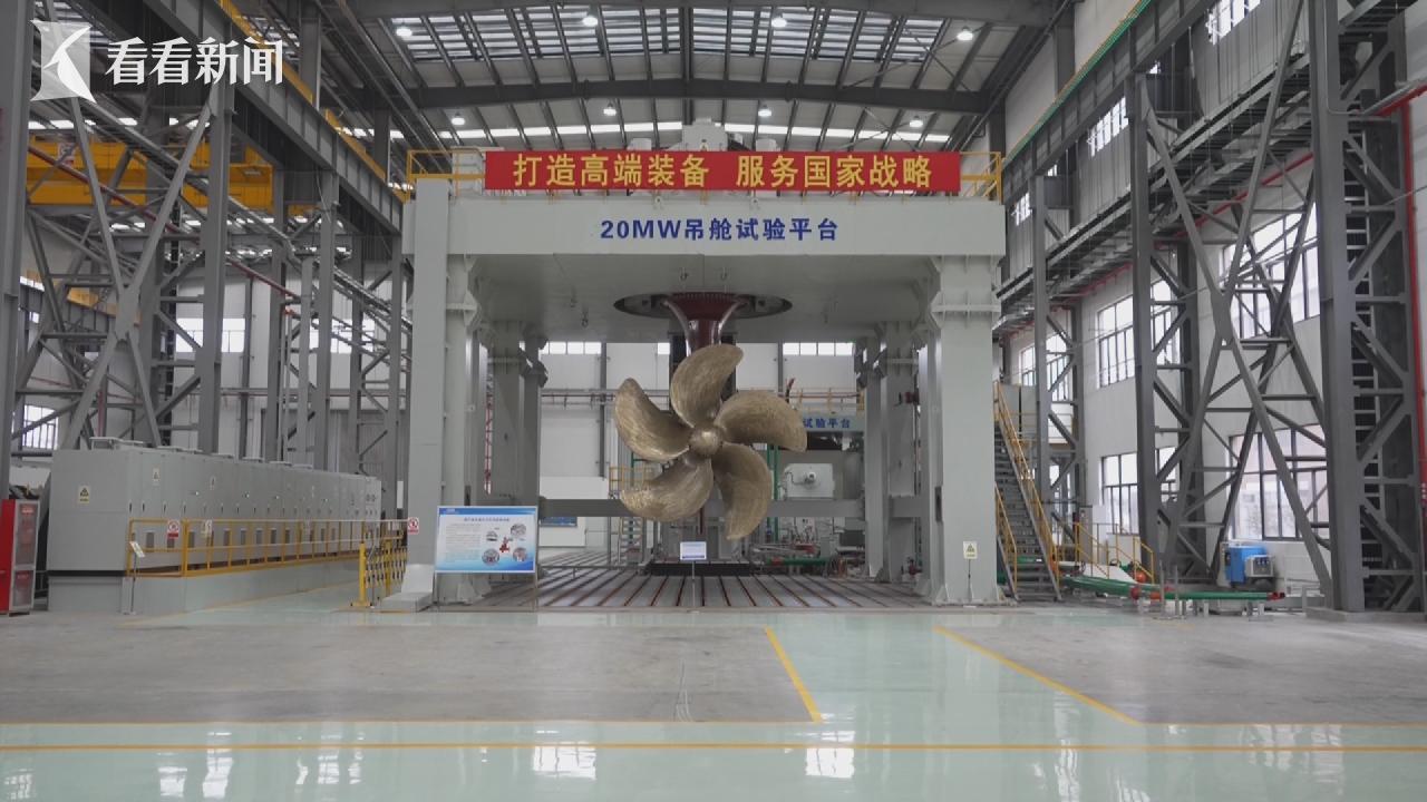 在长兴岛的一间厂房里,放着高9米的巨型装置,就是吊舱试验平台。与传统船舶靠舵转向,靠桨推进不同,吊舱推进器可以实现二合一功能,也就是超级方向盘+螺旋桨的组合体。它将电机与螺旋桨组合安装在一个壳体内,并悬挂在船体底部,可以实现360度全回转。