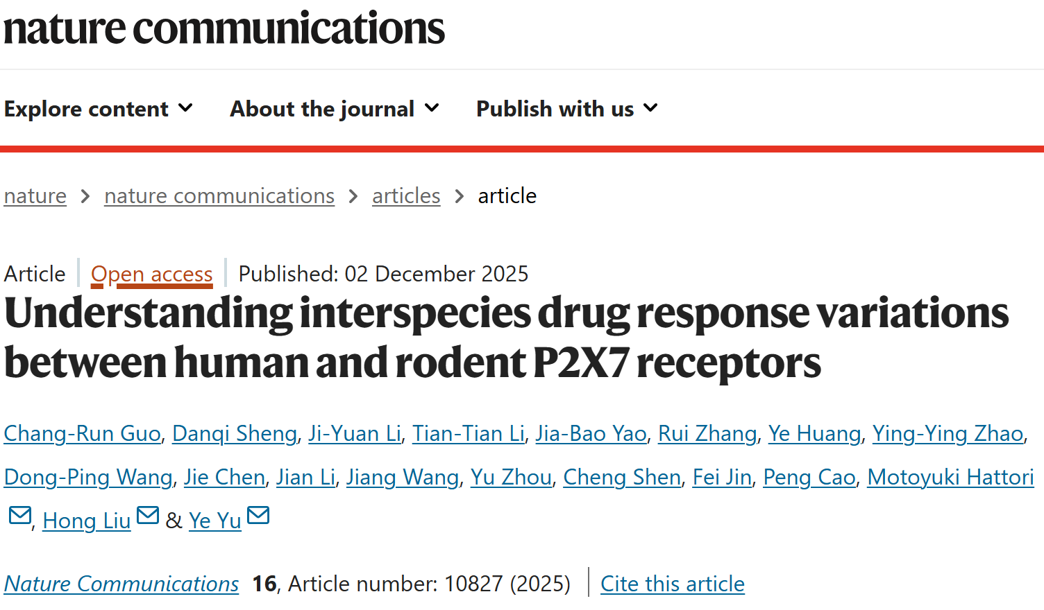 2025年12月2日,中国科学院上海药物研究所柳红研究员团队,联合中国药科大学/兰州大学于烨教授团队和复旦大学服部素之教授团队,在Nature Communications上发表题为“Understanding interspecies drug response variations between human and rodent P2X7 receptors”的研究论文。该工作发现了具有种属差异的P2X7受体小分子抑制剂,系统阐明了人类与啮齿类动物在P2X7受体药物响应上的物种差异机制,从结构与药理学层面解析了其分子基础,并进一步构建了规避上述差异的人源化转基因动物模型,用于预测靶向P2X7受体药物的体内药效和副作用,对实现更加精准、高效的药物发现具有重要意义。