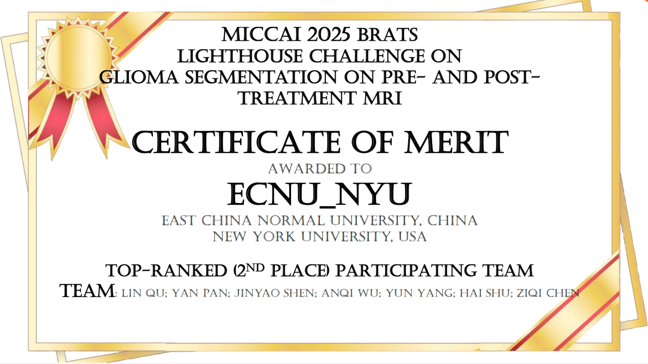 在技术层面,团队针对治疗前后肿瘤形态变化显著、术后组织重塑与信号异质性增强这一关键难点,团队在主流医学影像分割范式基础上,围绕“统一框架—分布差异建模—结构约束优化”构建了一套更具鲁棒性的解决方案:一方面,通过将术前与术后 MRI 纳入同一训练闭环,显式学习两种成像分布与病灶形态的差异;另一方面,结合不同肿瘤亚区(如强化区/非强化肿瘤核/水肿等)的结构特征与临床可分辨边界,对训练目标与优化策略进行针对性设计,从而在复杂病例(边界模糊、病灶碎片化、小体积残留等)中显著提升稳定性与泛化能力。该方法在官方隐藏测试集评测中表现突出,成为最终取得全球第二名的重要原因。