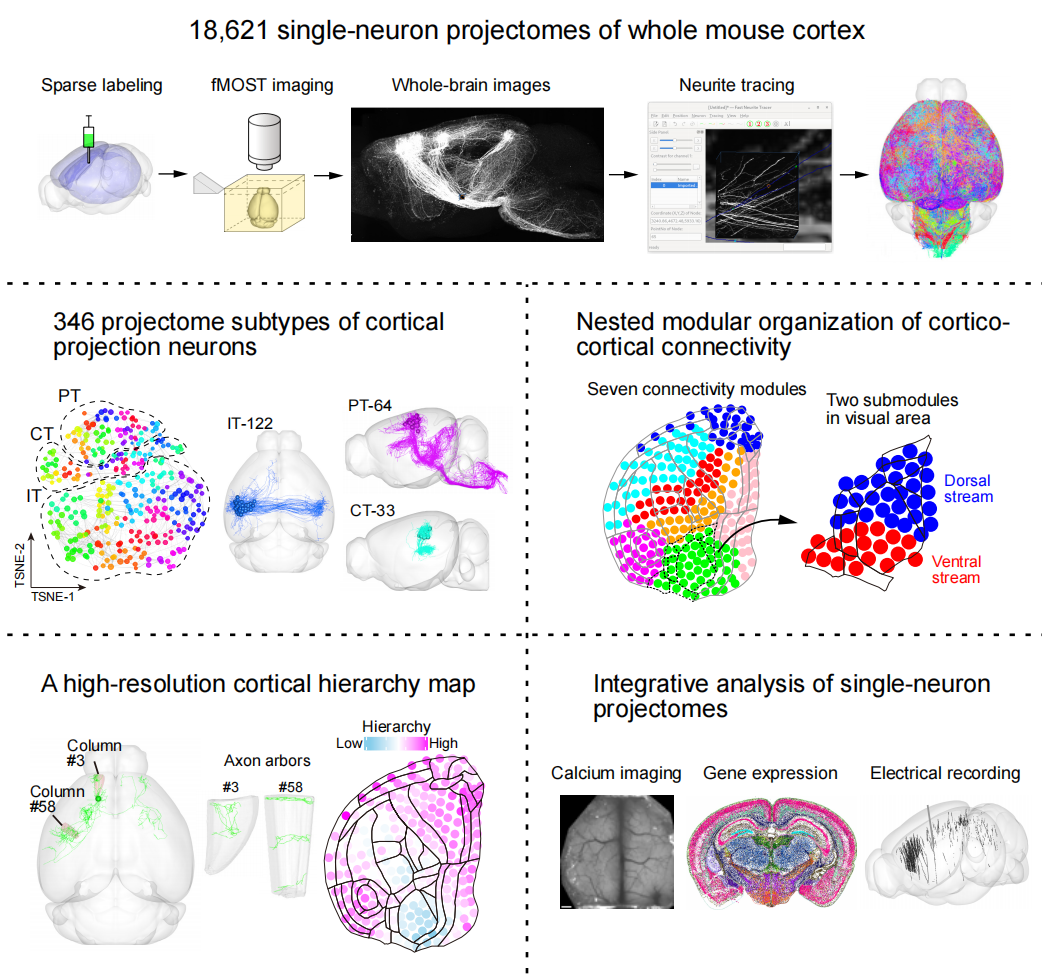 2026年1月7日,Neuron期刊以封面文章的形式发表了中国科学院脑科学与智能技术卓越创新中心(神经科学研究所)严军团队的题为《Integrative analysis of single-neuron projectomes links connectome, transcriptome, and function in the mouse cortex》的研究论文。在本期Neuron杂志中,严军团队绘制了覆盖小鼠全皮层区域的单神经元轴突投射图谱,揭示了大脑连接组、转录组与功能之间的内在关联。