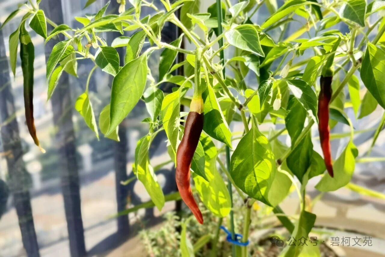 由于我家朝南的阳台在夏天阳光照不进来,辣椒苗第一次开花却未能座果。显然是阳光不足的原因,赶紧搬到夏天阳光多一点的北阳台。当枝条上出现幼嫩的小辣椒时,真让人开心!长着长着,小辣椒长成线条形的尖辣椒,而不是期待中的观赏椒——五色椒!这粒尖辣椒种子是如何跑到花圃里的呢?这是一个解不开的迷啊!
