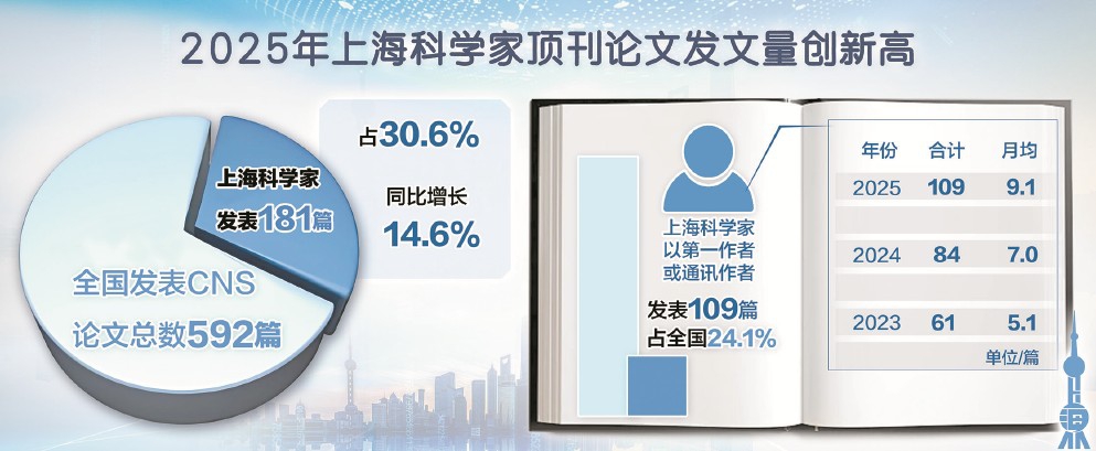 2025年,上海科学家顶刊论文发文量再创新高:在《细胞》《自然》《科学》(CNS)三大国际顶尖期刊上发表论文181篇,同比增长14.6%,占全国总数30.6%;其中以第一作者或通讯作者发表的顶刊论文109篇,较上年增长29.8%,这也是上海顶刊论文连续两年实现约30%高增长,增幅位居全国城市前列。