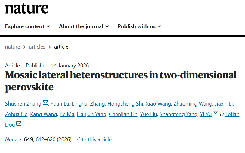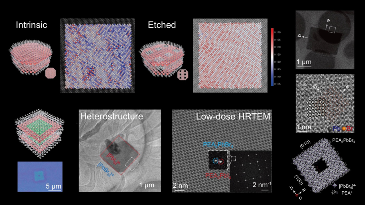 近日,上海科技大学物质科学与技术学院于奕课题组与美国普渡大学、中国科学技术大学科研团队合作,在图案化的卤化物钙钛矿横向异质结研究中取得突破性进展,利用低剂量电子显微成像方法揭示了卤化物钙钛矿材料的微观结构并证实了应变诱导的刻蚀机理。北京时间1月14日,相关研究成果以“Mosaic lateral heterostructures in two-dimensional perovskite”为题,在线发表于国际学术期刊《自然》(Nature)。