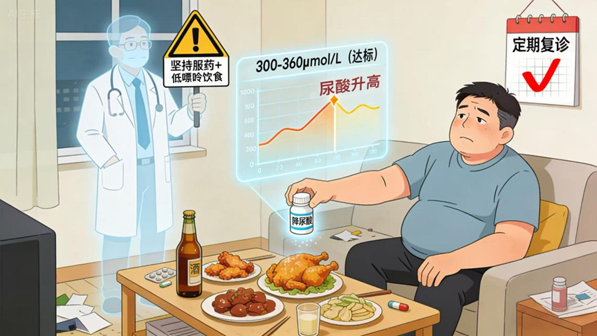 尿酸值的大幅度波动可诱发痛风发作。因此,必须改变不合理的生活方式,如深夜喝酒、剧烈运动、承受较大压力等。如果有发作先兆出现,可服用秋水仙碱1片。