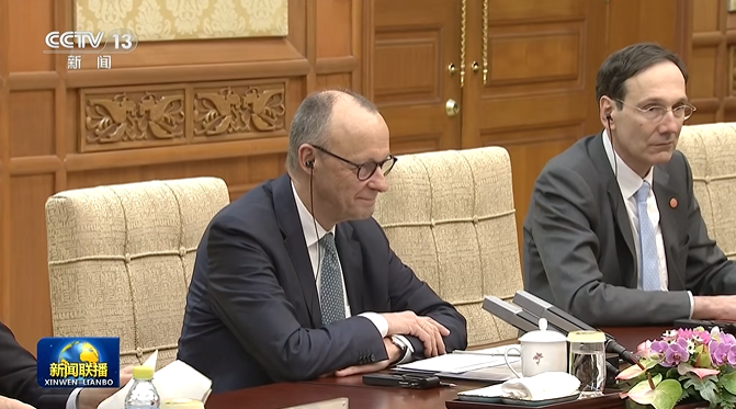 默茨表示,很高兴在中国人民欢庆春节的时候来华访问,祝中国人民马年吉祥。德中建交以来保持着友好交往和密切合作,为两国人民带来福祉。德方珍视对华关系,坚定奉行一个中国政策,愿同中方一道,延续友好传统,坚持相互尊重、开放合作,不断深化两国全方位战略伙伴关系。德国企业界高度重视中国市场,希望进一步深化对华合作,实现互利互惠、共同发展。国际局势正在发生深刻变化,德中肩负着共同应对全球挑战的重要责任。德方期待同中方加强协调,坚持自由贸易,反对保护主义。欧盟同中国发展可靠和持久的经贸合作关系符合双方利益,也有利于世界稳定繁荣,德方支持欧中加强对话与合作。