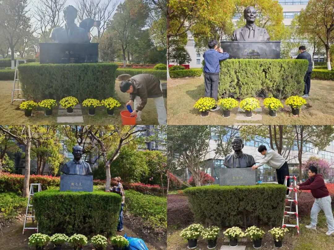 活动前,安全与保障管理办公室、研究生党总支组织人员擦拭雕像。研究生代表刘仍谦、路风豪,李彬、蔡延保,王乐、曾林,刘付晨、王逸超分别为周仁、严东生、殷之文、李家治四位老先生雕像进行擦拭。